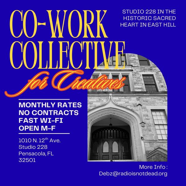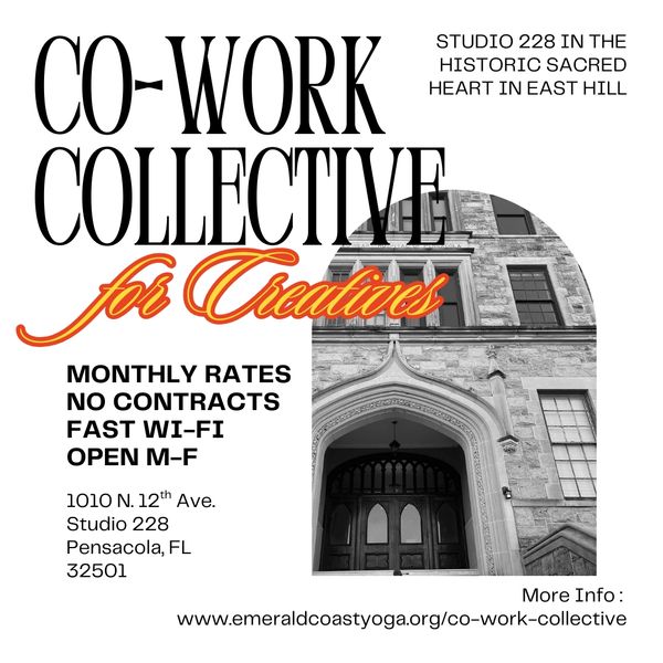 Our co-working space is located in the Sun Room of the 2nd floor of the historic Sacred Heart Hospital in Pensacola's East Hill neighborhood and includes a worldwide radio station, a yoga studio, a photography studio and an art gallery! Coffee, tea, and lunch options are on-site.